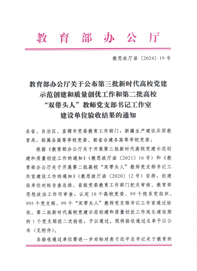 (通讯员:宇锐)近日,教育部办公厅公布了全国第三批新时代高校党建示范创建和质量创优工作建设单位验收通过名单。我院学生第一党支部通过“全国党建工作样板支部”创建验收。