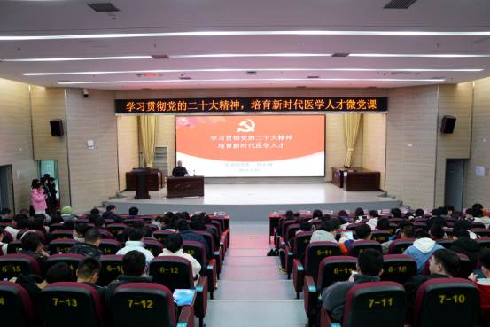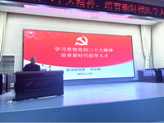 向志钢强调要通过深刻领会“五个牢牢把握”,来学习贯彻党的二十大精神,指出要以党的二十大精神为指引,全面推动我校医学教育事业的高质量发展,扎根武陵山区,为健康湖南和健康中国建设培养更多的新时代医学人才,要抓住医学教育质量生命线,不断深化医学教育体制改革,进一步提升教学水平和人才培养质量;要持续提升医学科研创新能力和水平;要积极推动医学与其他学科的深入融合,要加强学科建设及科技成果转化,进一步提升社会服务能力;要强化人才队伍建设,夯实高质量发展根基;要切实改善教育教学条件,稳步提升医学教育治理能力;要加强思想政治工作与医学文化建设,坚持用习近平新时代中国特色社会主义思想培根铸魂,培育新时代医学人才。