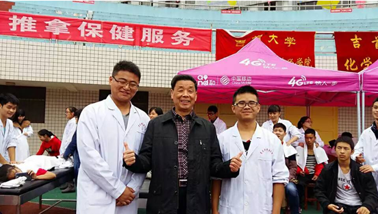 3:我校原副校长、退休教授张永康在接受推拿服务后对志愿者表示赞赏和感谢