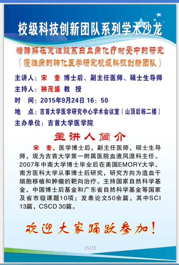 当前位置: 首页» 永利集团» 学术活动 校级科技创新团队系列学术沙龙 时间:2015-09-24 点击: 作者:佚名 上一条:外泌体MIR在心血管中的研究进展 下一条:2015-2016年第一学期学术报告安排 【关闭】