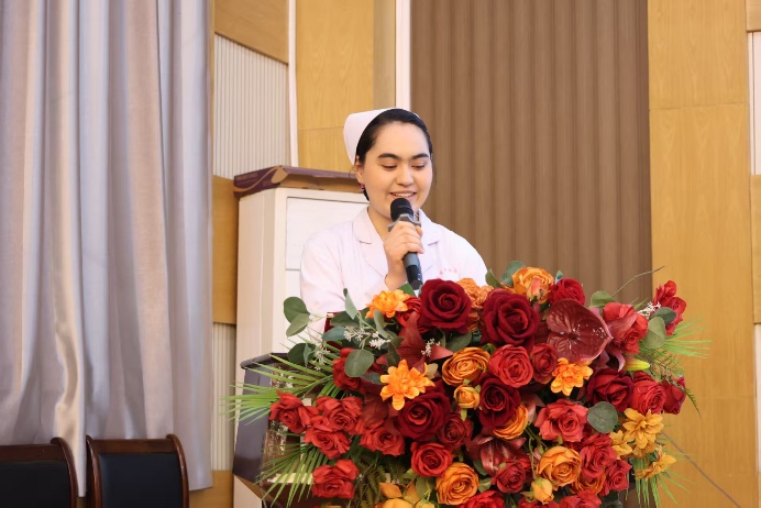 护理系优秀毕业生代表夏黑旦木·依马木结合自身经历,向在场师生分享护理学习与工作心得:有信念的坚定和不懈的努力,就没有克服不了的困难。她对学弟学妹寄予殷切期望,指出护理之路充满挑战,希望我院学子始终保持对护理事业的热爱,扎实学好专业知识,稳步提高专业技能。