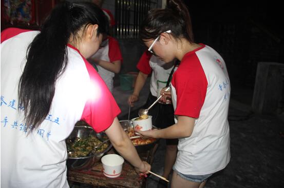 晚上8点整,停电了的河溪镇陷入一片漆黑,一座民房院子前闪烁着温暖的烛光。yl6809永利YL集团领队老师们在厨房里为队员们准备着丰盛的晚餐,同学们看着老师们被汗浸湿的衣襟,心中充满着感恩。“这是我的第二碗饭!”指导老师彭校辉朗声说到。色香味俱全的餐食填饱了每位同学的肚子,老师们在温暖烛光下的剪影也温暖了每个团队成员的心。
