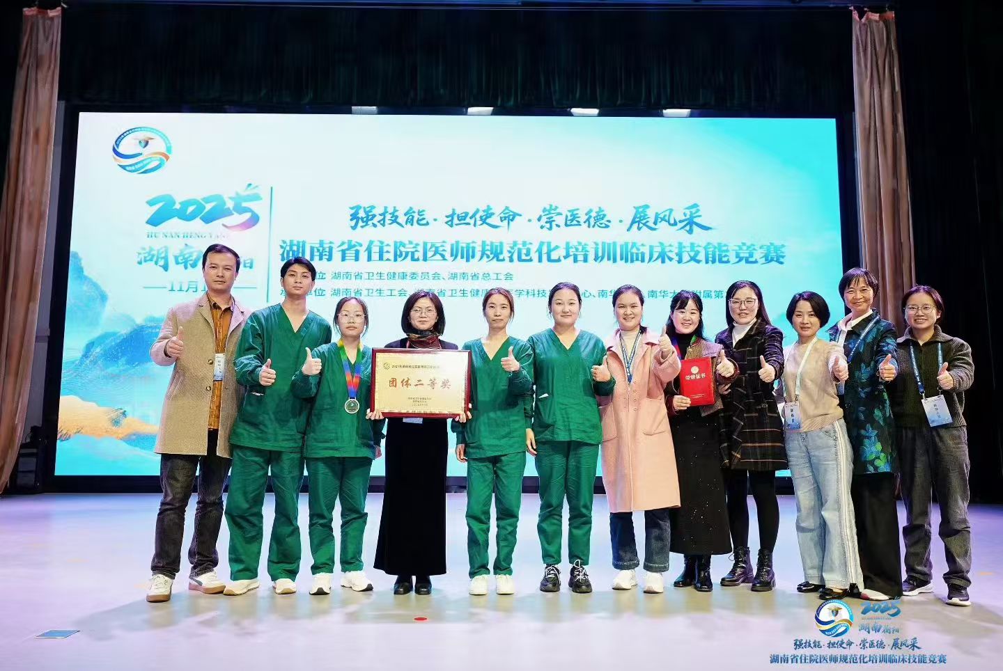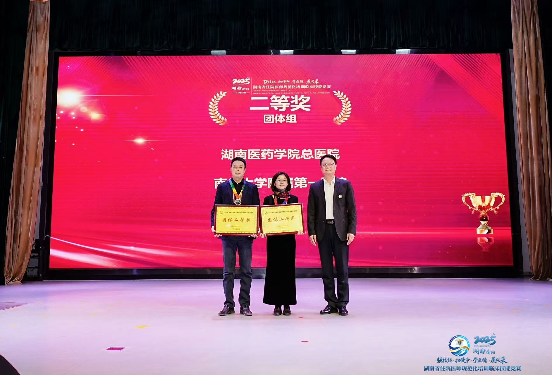 (通讯员:曾婧、王本周)初冬雁城,技能逐梦。11月15日,由湖南省卫生健康委、省总工会联合主办的2025年湖南省住院医师规范化培训临床技能竞赛在衡阳圆满落幕,经过多轮激烈角逐,我院2023级临床医学专业硕士研究生肖欢脱颖而出,作为湖南医药学院总医院1号选手参赛.她与团队成员配合默契,发挥出色,凭借扎实的临床功底、规范的操作流程和高效的团队协作,最终以总分第二的优异成绩,荣获团体二等奖,充分展现了我院医教协同育人的显著成效。
