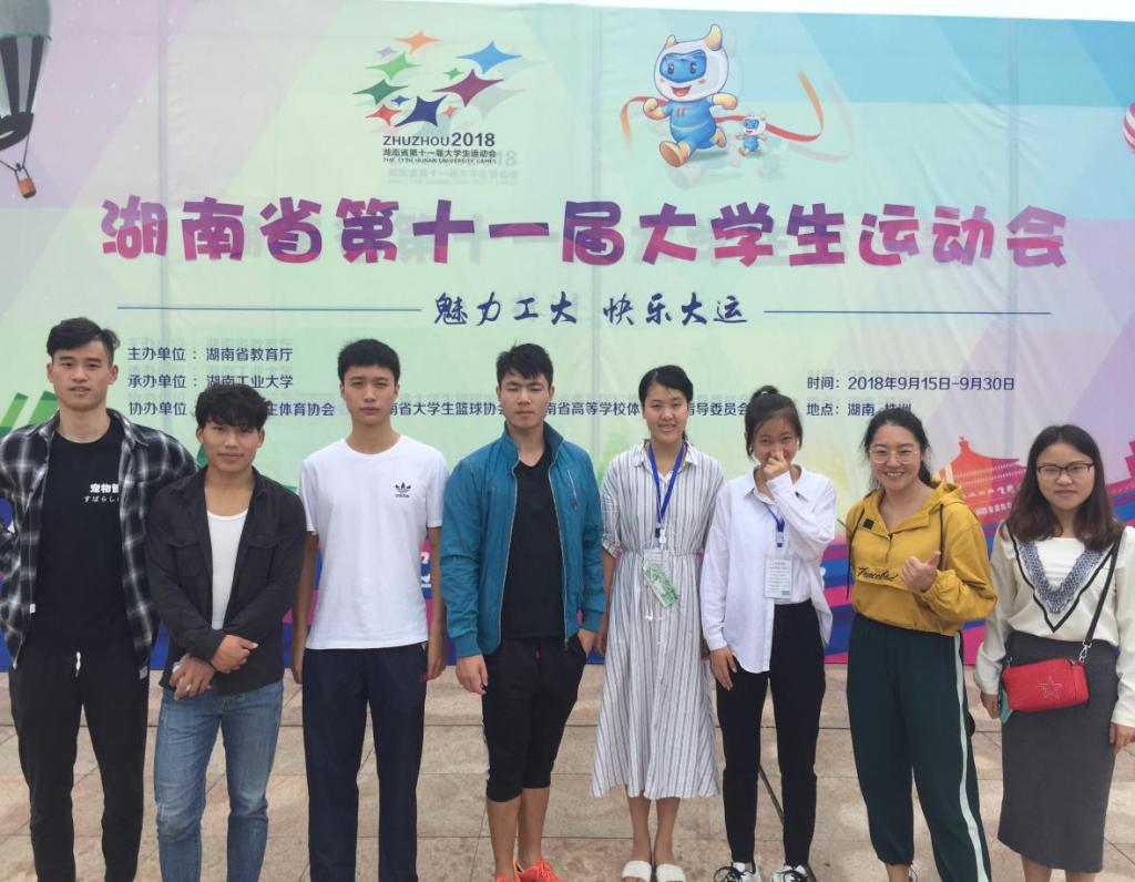 图为湖南省第十一届大学生运动会合影留念(右一:符慧贤同学,右二:张乃丹同学,右四:易葳同学)