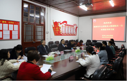 (唐海欧)3月26日上午,株洲市中心医院副院长龙云铸一行来我院考察交流。考察交流座谈会在我院办公楼208会议室举行,我院院长彭小宁,副院长向明钧,院办公室主任刘英姿、护理系主任罗雪梅等参加了会议,会议由副院长向志钢主持。