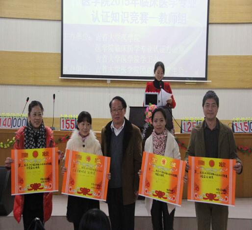 在比赛结束后,谭院长总结了此次的竞答比赛非常精彩,对老师的竞答和同学的娱乐环节表示赞叹。希望这样的活动以后能更多,会更精彩。最后为获奖教师队伍代表颁奖并合影留念。此次活动由yl6809永利YL集团临床医学专业认证办公室,yl6809永利YL集团学工办主办。yl6809永利YL集团团总支,学生会承办。