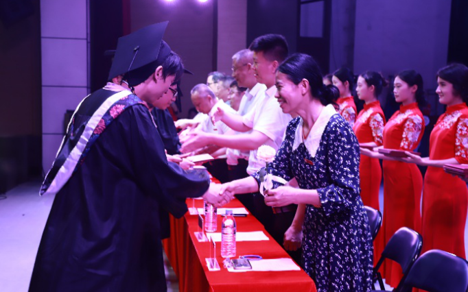 毕业证书颁发环节,领导老师们为2025届毕业生送上了证书和诚挚祝福。毕业生们有序上台,微笑鞠躬,接过老师手中的证书,并向支持、陪伴他们成长的师长们表示感谢。